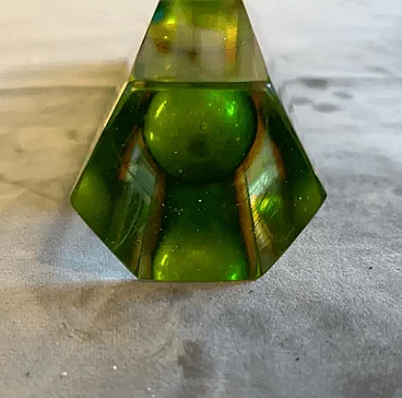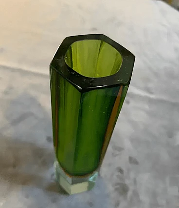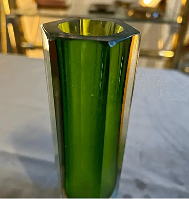 Hexagonal Murano glass vase in excellent condition, green and yellow in colour, made in Venice by Mandruzzato in the 1960s. The vase is an extraordinary example of Italian craftsmanship and design. This vase is characterized by its unique shape, bright colors and the innovative Sommerso technique used for its creation. The vase is made of Murano glass, renowned for its quality and clarity. The hexagonal shape of the vase adds a geometric element to its overall design. The sides of the vase create six distinct panels, giving it a modern, architectural look. This shape was a popular choice during the Mid-Century Modern period, reflecting the era's fascination with clean lines and geometric shapes. Diameter: 6cm.