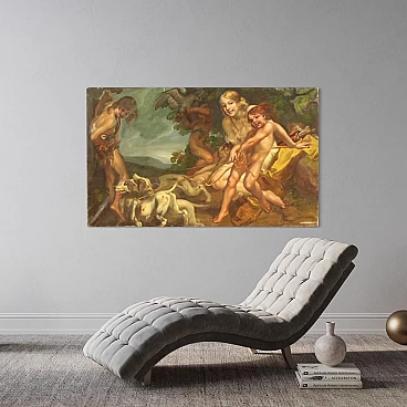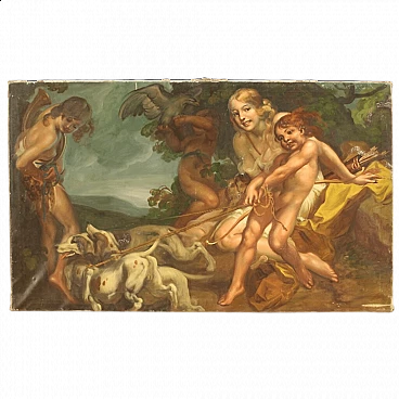 Italian painting from the first half of the 20th century. Oil on canvas painting depicting mythological subject Diana the Huntress by an excellent painterly hand. Painting of great size and impact, with excellent luminosity and dynamism, missing frame. Unsigned painting attributable to Mattia Traverso (1885-1956) lacking authentication. First canvas work showing various signs of time and small colour fades (see photo). Painting for antique dealers, interior decorators and collectors of 20th century Italian painting. In fairly good state of preservation with some signs of time.