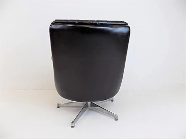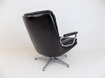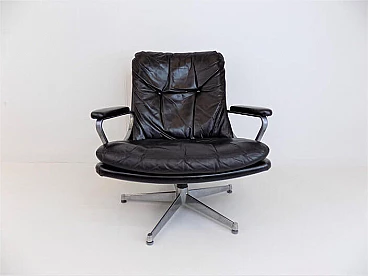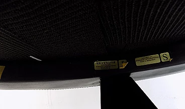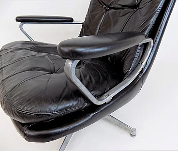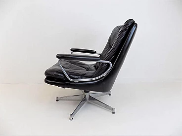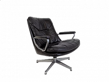 This black leather Gentilina chair is in good condition. The leather and stainless steel backrests show minimal signs of wear. The backrest has a slight scratch and the front corners have abrasions. Andre Vandenbeuck designed this armchair for Strässle in the 1960s, creating a classic. Since 1886, the Swiss manufacturer Strässle has been producing upholstered furniture of the highest quality craftsmanship and timeless design. Strässle has distinguished itself by using the finest leathers for its furniture and producing products of the highest craftsmanship. The Gentilina has become a classic sought after by collectors.