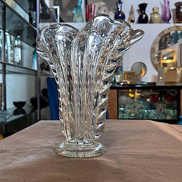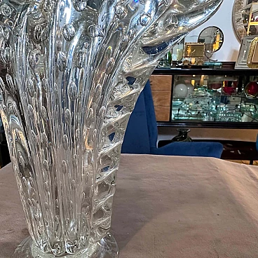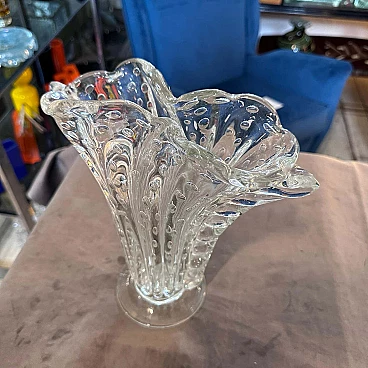 Transparent Murano glass vase designed and produced in Venice by Barovier in the 1950s. It is in excellent condition. Barovier's vase is an extraordinary piece of art glass that showcases the craftsmanship of Murano glassmaking and the iconic style of the Mid-Century Modern era. Created by the renowned Italian glassworks Barovier, this vase is a testament to their craftsmanship and innovation. The vase features a distinctive technique called 'bullicante', which involves the creation of controlled air bubbles within the glass. These bubbles add an eye-catching and dynamic element to the vase, creating a sense of movement and texture. The bullicante technique was very popular during the Mid-Century Modern period and is often associated with the Murano glass tradition.