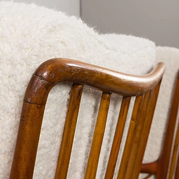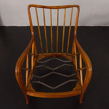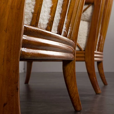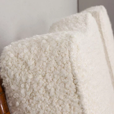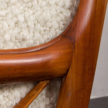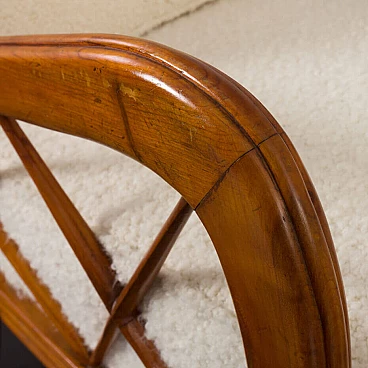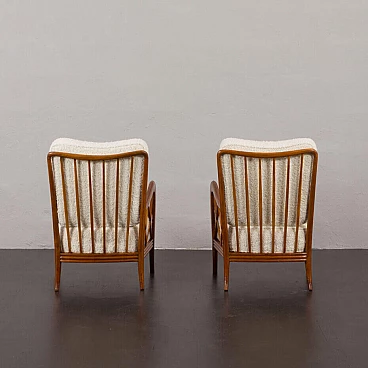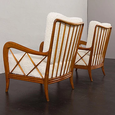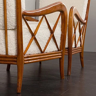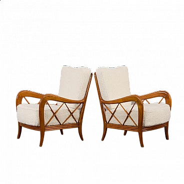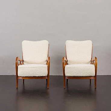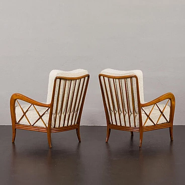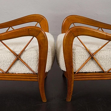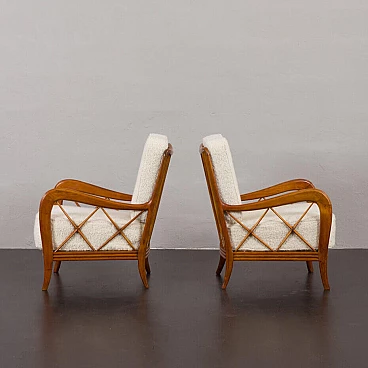 An elegant pair of Italian armchairs by Paolo Buffa, one of the most prolific designers and architects of the 20th century, dates from the 1950s. The cherry wood frame has a special feature in the armrest. The soft curvature of the wooden frame is enhanced by X-shaped slats that create a geometric play. The chairs have been renewed and upholstered in L'Interno's Italian natural wool boucle fabric by Franco Fabbri. The internal foams and coil springs of the seats have also been restored. Given their value and elegance, these lounge chairs are the perfect complement for classy and stylish living rooms. It is a true example of mid-century Italian style that is both modern and functional. The wooden frames are stable and preserved in their original condition with some traces of use. The seats and backrest have been completely renewed with new upholstery. Seat height 40 cm, armrest height 57 cm, floor height 17 cm.