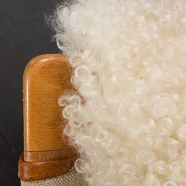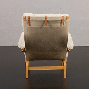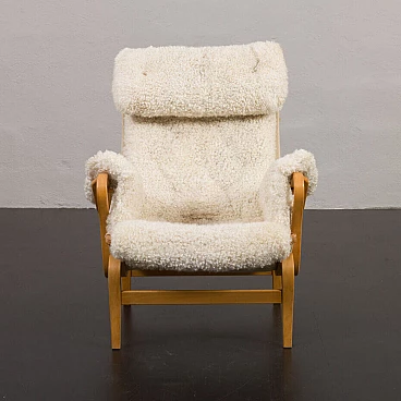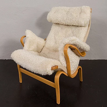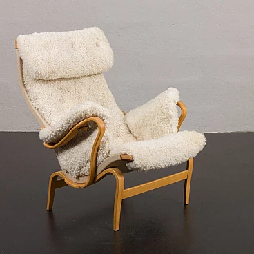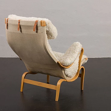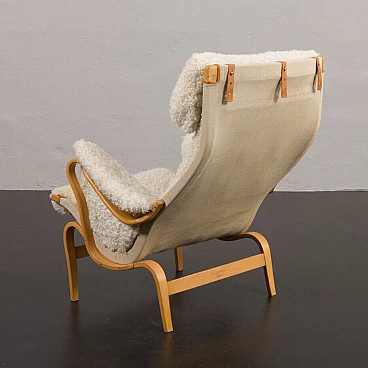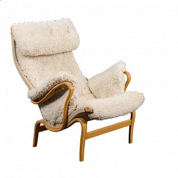 This extremely comfortable lounge chair by Bruno Mathsson, made by Dux, is an improved version of Pernilla from the 1960s (the original version was made in 1944). The armchair has a minimalist, organic design with a curved seat and backrest. It is made of curved beech plywood, canvas and a new natural sheepskin upholstery, which makes the piece extremely comfortable, perfect for long cold evenings with a book. Sheepskin has great anti-allergic properties and provides an electrostatic balance, which is very important in contemporary interiors full of artificial materials. Original Dux cover preserved. Overall, the Perilla chair is a beautiful and functional piece of furniture that embodies the Danish design philosophy of simplicity, functionality and quality. The excellent state of preservation offers overwhelming comfort! It is one of the most comfortable lounge chairs in history. Wood and canvas in original condition with slight traces of use. Seat height 42 cm, armrest height 59 cm.