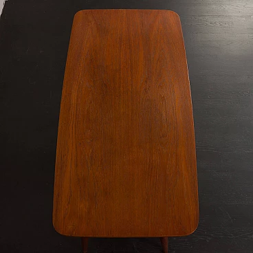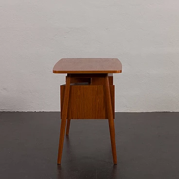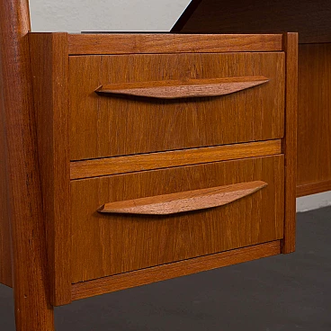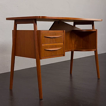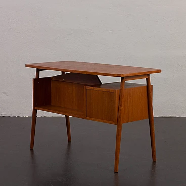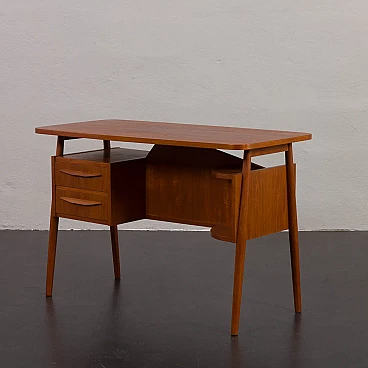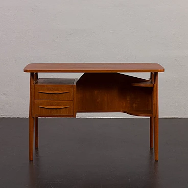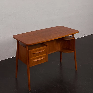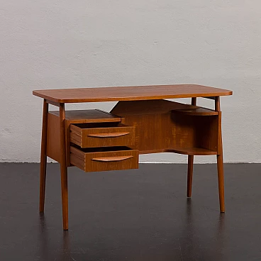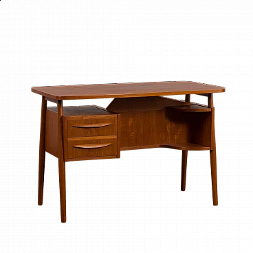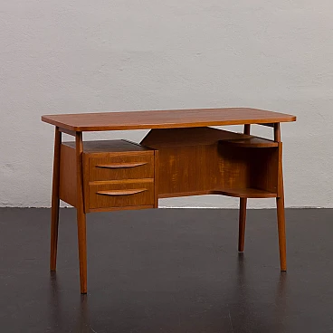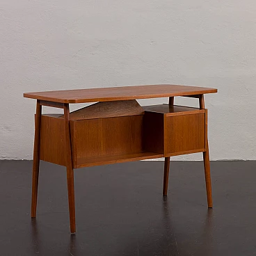 A small, elegant women's desk by G. Nielsen Tibergaard, made in Denmark, dates from the 1960s. The desk is made of teak with solid teak handles and legs. Due to its unique design, it has a 'floating' top that enhances the lightness of the piece. It has two drawers and two small rounded shelves at the front, as well as an open storage space at the back. Overall, the desk is in fantastic original condition with slight traces of use, such as light discolouration. The wood has been preserved with layers of Danish oil. Drawer height 8.5 cm, chair space 20 cm.