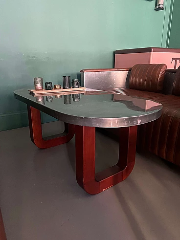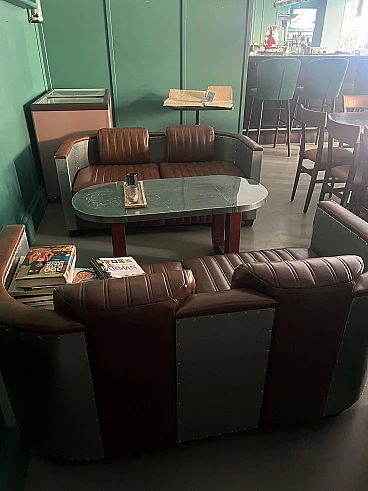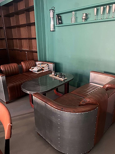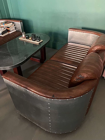 Pair of leather and metal Art Deco sofas and coffee table, 2000s