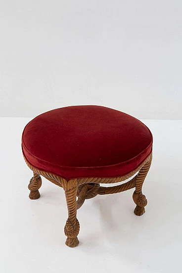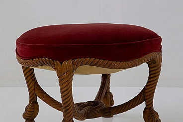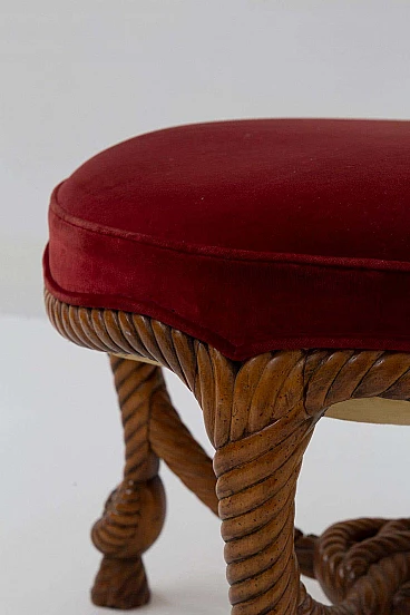 The pouf seat, upholstered in red velvet, lends importance and regality to the entire piece. This touch of elegance is further accentuated by the choice of velvet, which gives the product a sumptuous appearance. The combination of carved wood and red velvet creates a fascinating contrast, reflecting the distinctive style of the Napoleon III period. It is important to emphasise that this type of stool was created during the reign of Napoleon III by A.M.E. Fournier (well-known decorator), whose contribution is significant. The rope-shaped base is a characteristic element of this type of stool. Given its historical relevance, the stool or ottoman can be attributed to the 19th-20th centuries. It is a piece that evokes the opulence and luxury of the Napoleon III period, making it a prestigious addition to your décor. In short, the important French stool or ottoman, in the manner and style of Napoleon III and Fournier A.M.E., is a piece of great historical and artistic value. With its carved wooden frame in the shape of a rope, feet forming a double knot and red velvet seat, it is an excellent testimony to the period. Purchasing this stool will not only enrich your room with a historically significant piece, but will also add a touch of royalty and sophistication to your décor.