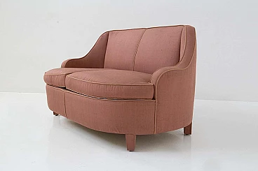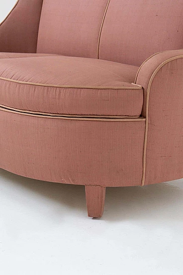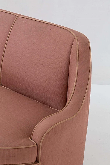 The sofa retains the original fabric from the time of its creation, still in good condition. The pink cotton fabric adds a touch of charm and nostalgia, reflecting the design aesthetic prevalent in the mid-20th century. This original fabric not only enhances the authenticity of the sofa, but also serves as a testimony to the enduring quality of the piece.