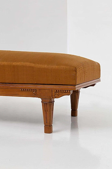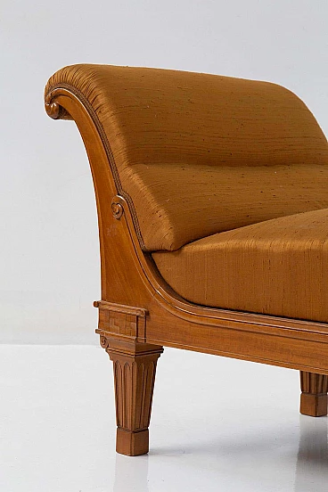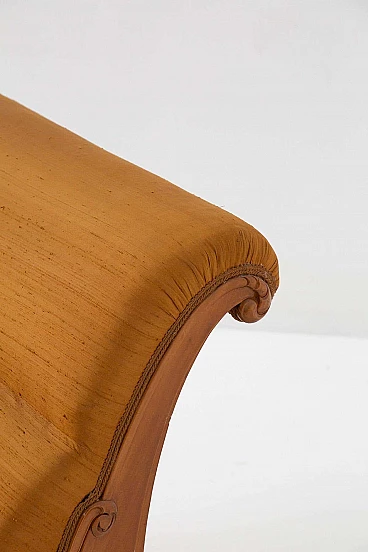 A distinctive feature of the chaise longue is the curling of the upper part of the backrest. This design element adds a touch of elegance and preciousness to the seat, further emphasising its artistic and historical significance. The careful upholstery of the backrest ensures maximum comfort for the guest, as it is generously padded with a double layer. This focus on comfort, as well as aesthetics, makes the chaise lounge a truly inviting and luxurious seating option.