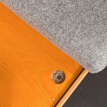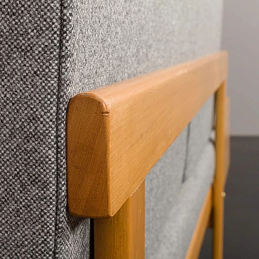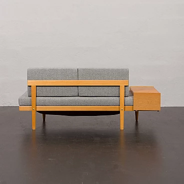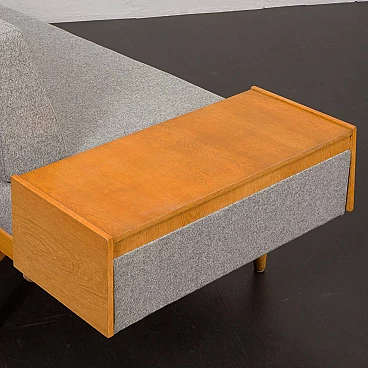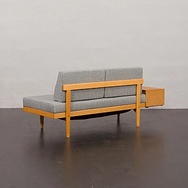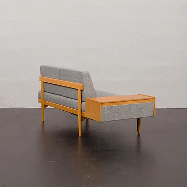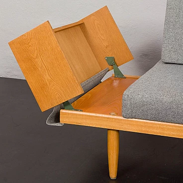 A true code of Norwegian minimalism and purity, this Scandinavian oak Svane daybed accompanies you day and night. The Svane daybed or sofa was designed by Ingmar Relling for Ekornes and produced in the 1970s. It functions as a bed when fully open and also has a compartment for sheets and blankets. The table moves easily up and down and has a specific stop point. The solid oak frame combined with a light ash-coloured natural wool cover gives the impression of simplicity and elegance at the same time, a classic of modern Scandinavian design. The daybed was checked by our team. We made sure that all the mechanisms work properly. On many occasions, we have to sand the most used parts (if they are heavily scratched). Here we only cleaned with professional compounds and preserved with Danish oil. We leave small signs of use that do not spoil the aesthetics and only confirm originality. We try to restore it to its best appearance, always considering that it is 60 years old. Overall, fantastic condition, with slight traces of use. New foam and upholstery.