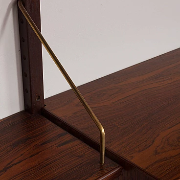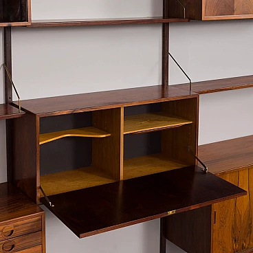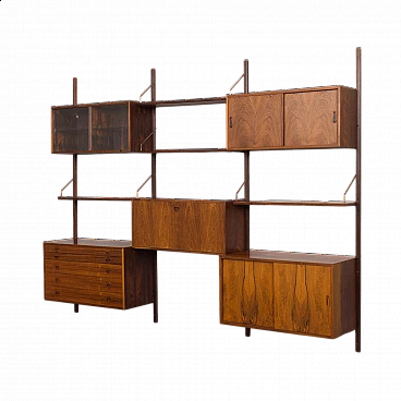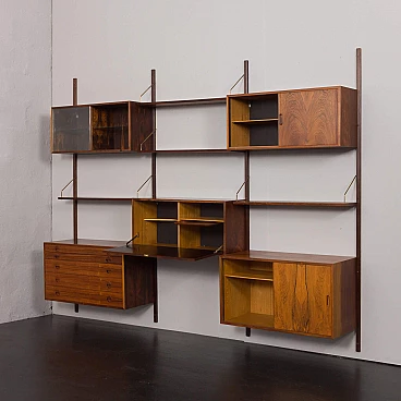 An elegant modular rosewood bookcase with five cabinets, one of the finest mid-century Danish rosewood wall units, designed by Rud Thygesen and Johny Sorensen for Hansen & Guldborg in the 1960s. It features brilliant joinery and rich rosewood grain. It consists of: a cabinet with sliding doors H: 50 / W: 90 / D: 40 cm; chest of drawers with five drawers; H: 49.5 / W: 90 / D: 40 cm deep (the first two drawers are 4 cm high, the rest are 9.5 cm high); bar cabinet with adjustable shelves and tray; H: 40 / W: 90 / D: 30 cm; cabinet with sliding doors and adjustable shelf; H: 40 / W: 90 / D: 30 cm; cabinet with glass doors and adjustable shelf; H: 40 / W: 90 / D: 30 cm; 4 shelves 22 cm deep; 4 wooden rails 209 cm long; brass hardware.