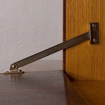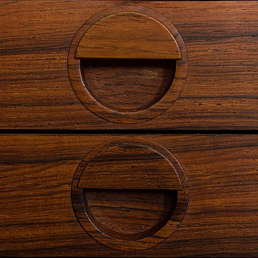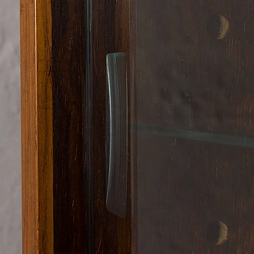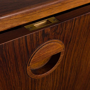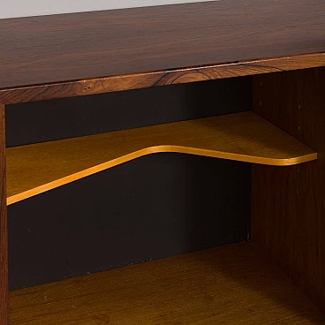 Fantastic vintage condition with slight signs of wear, such as a small chip on the glass door, small scratches on the tops and slight differences in the colour of the veneer. Rosewood is very reactive to light and the parts most exposed to UV rays fade much more quickly. The upper cabinet (with wooden doors) has a functional opening, e.g. for cables.