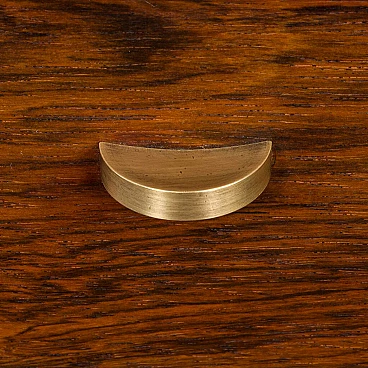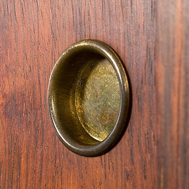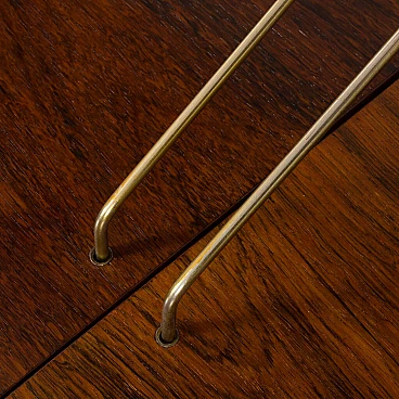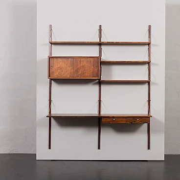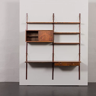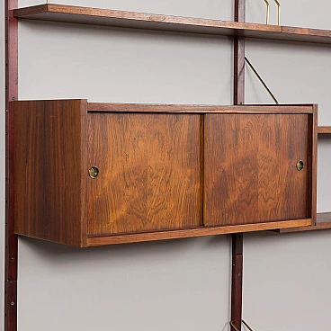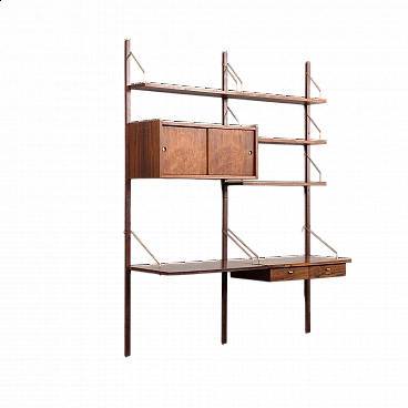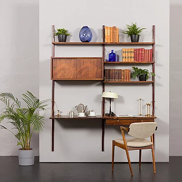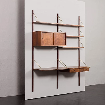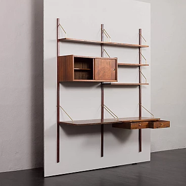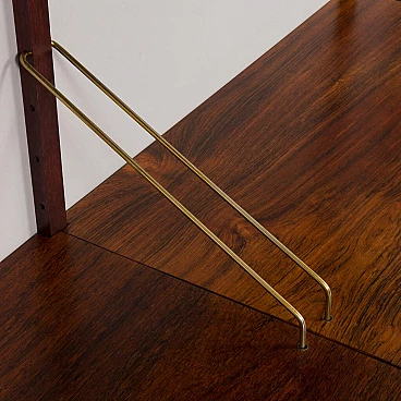 Danish Mid-Century home office shelving designed by Preben Sorensen and produced by PS System, Randers, in the 1960s. This fully modular shelving system is ideal for a home office, as the compact desk also allows one to work in the living room. The entire set is veneered in fine-grained rosewood and rests on solid wood rails. Particularly noteworthy are the brass details on the cabinet and drawer handles. The set consists of: 4 shelves 20 cm deep,
