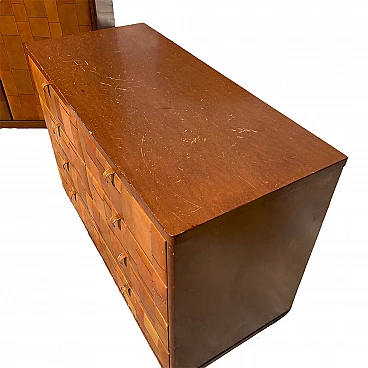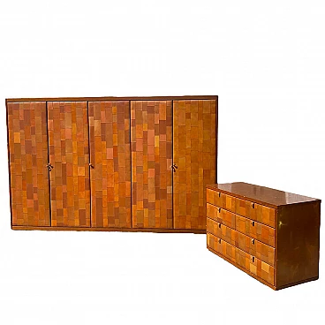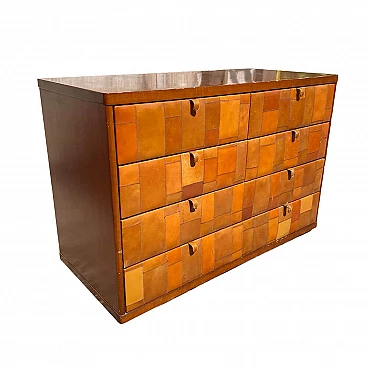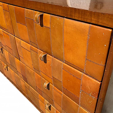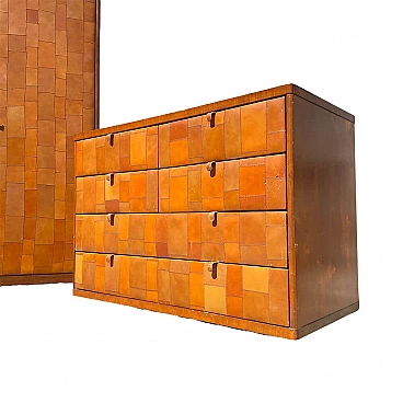 Incredible and extremely rare chest of drawers designed by Tito Agnoli for Caleido, a Poltrona Frau company, in the 1970s. The object is of unbelievable workmanship, with Pecary leather drawers hand-stitched in petchwork, using the finest leather on the market, i.e. that used by Hermès for one of the most expensive bags it produces, the Birkin. The object is accompanied by expertise and authenticated directly by Frau SPA. The only example currently on the market and an object of remarkable Italian craftsmanship from the 1970s, possibly complete with matching wardrobe as shown in the photographs, which can be purchased separately in another lot. The item is in excellent vintage condition, some signs of wear as shown in the photographs, only two half-inch holes due to the previous owner's cat.