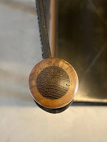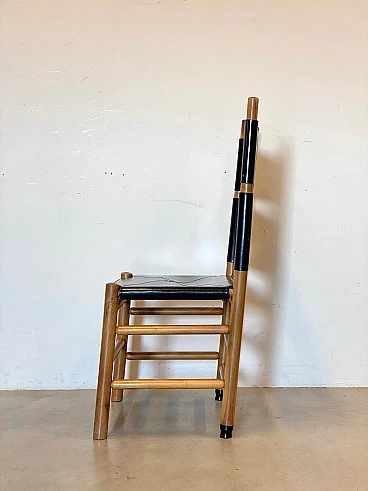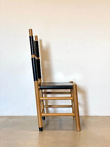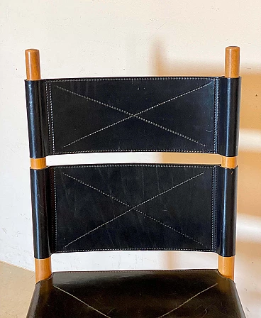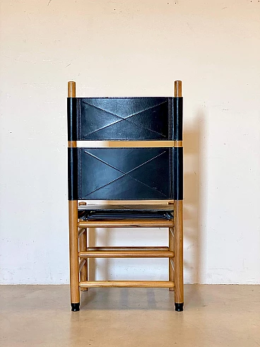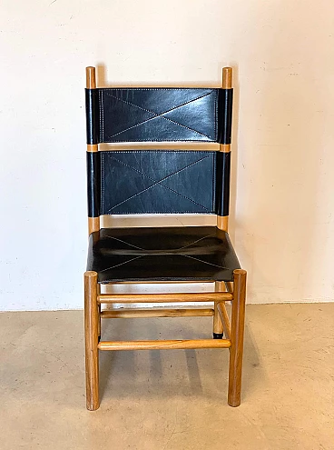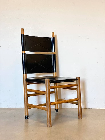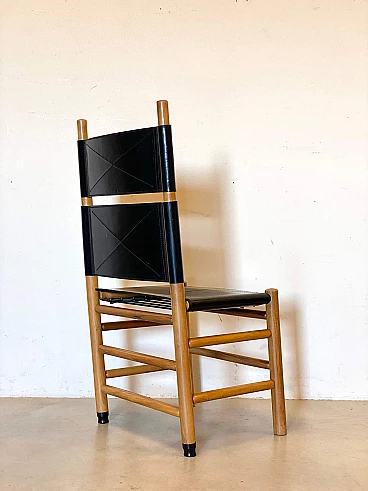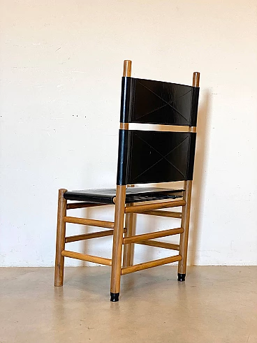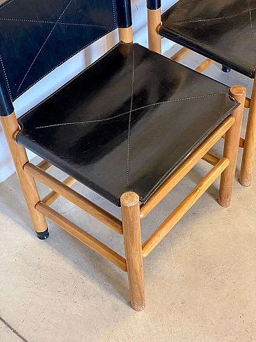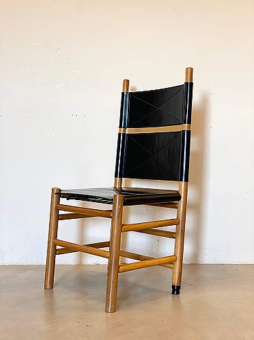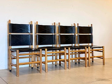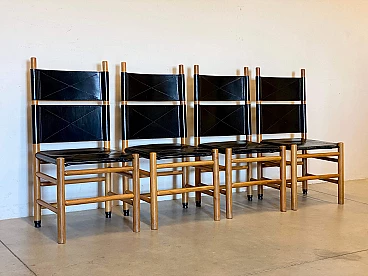 Four Kentucky model chairs designed by Carlo Scarpa in the 1970s and then produced by Bernini in the 1980s. Seat and back in black leather with visible stitching, walnut wood, brand name present on the black rear feet. Carlo Scarpa designed this chair for the "Scuderia" series, the last project he did for Bernini, he was inspired by the "shaker" movement by designing the chair slightly inclined at the front. This feature allows it to swing backwards (until it leans against a wall) and remain balanced.