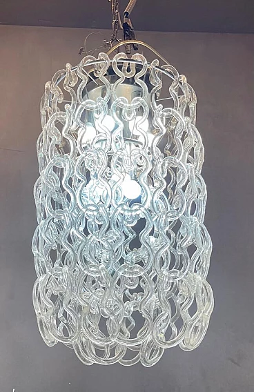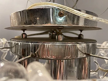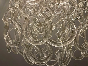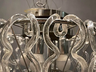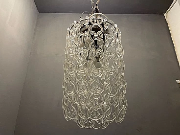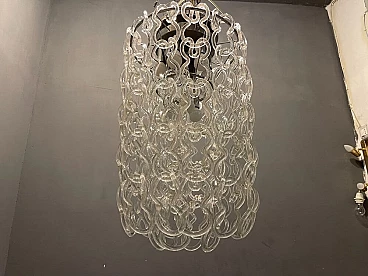 Original mid-century crystal chandelier from the "Giogali" series, produced in Italy between the 1960s and 1970s. Giogali is the collection of lamps designed by Angelo Mangiarotti for Vistosi. It is a decorative chandelier, composed of many transparent Murano glass links that can be playfully hooked onto a chrome-plated metal frame at will. Once the chandelier is turned on, the handcrafted Murano glass meshes refract light. Minimum height 65 cm, Maximum height 100 cm, Width 37, Features 9 lights, Requires E14 bulbs