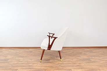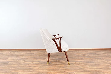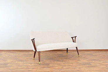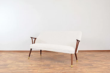 Norwegian teak, brass and beige bouclé fabric sofa, 1960s