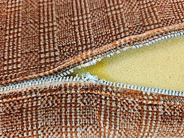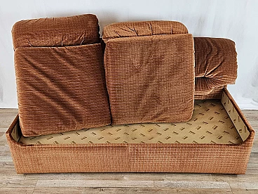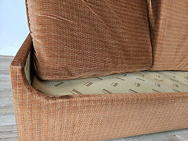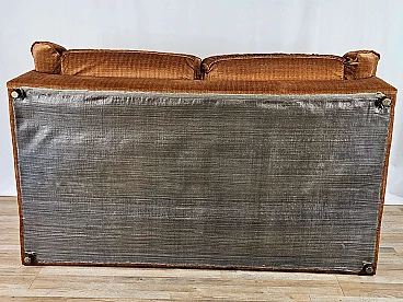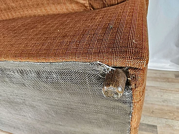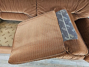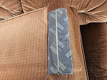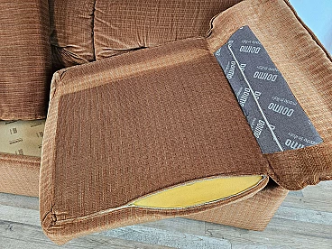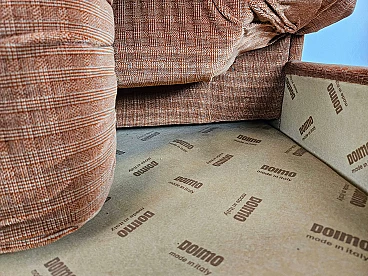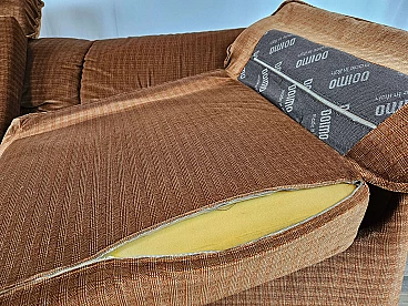 Two-seater sofa by Doimo, 1970s. Padded and upholstered with brown fabric, it has two cushions on the seat with side armrests. Trademark shown several times under the cushions. The hinge on one of the cushions is oxidized and damaged but this is irrelevant as it is on the underside.