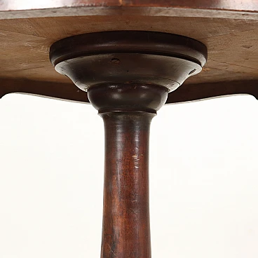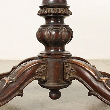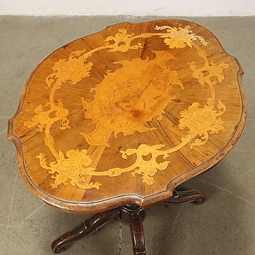 Umbertino biscuit coffee table in walnut with shaped top inlaid in maple depicting Good Samaritan scene within scroll. Carved baluster terminating in four curl feet. Italy late 19th century.