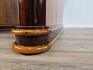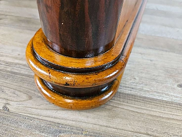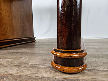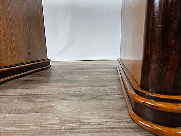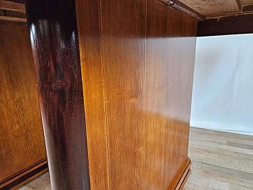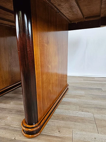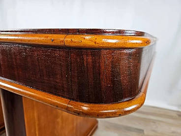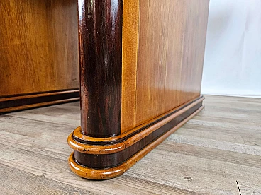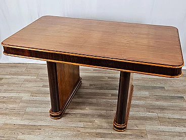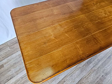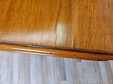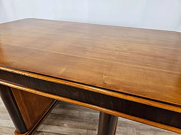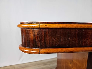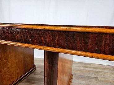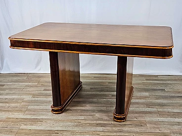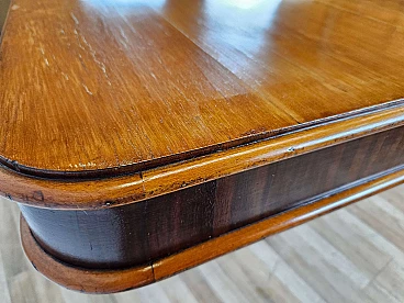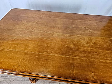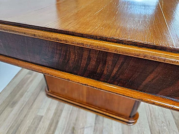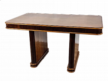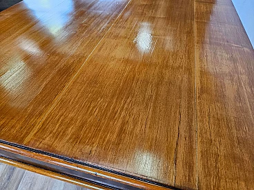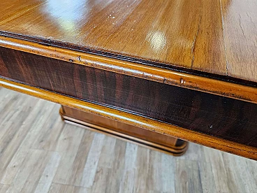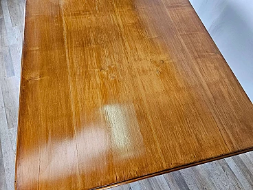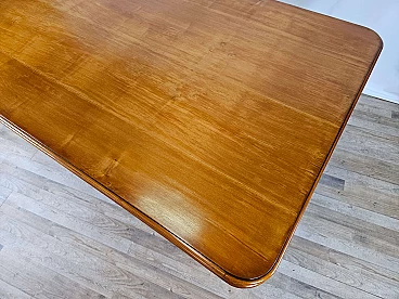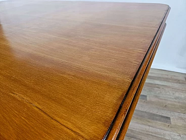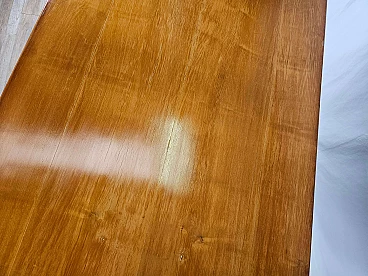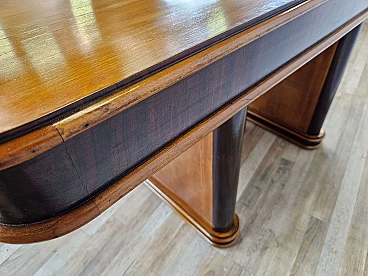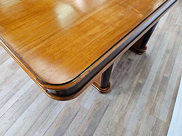 Elegant and modern dining table in blond walnut burl with mahogany details. Light in form and linear in size, it lends itself to any kind of environment. The table has been shellac polished and is ready for use. It shows normal signs of age and use.
