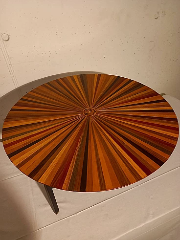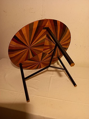 Coffee table from the 1970s. Three metal legs, plexiglass feet and wooden top inlaid by Varotti Mauro.