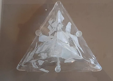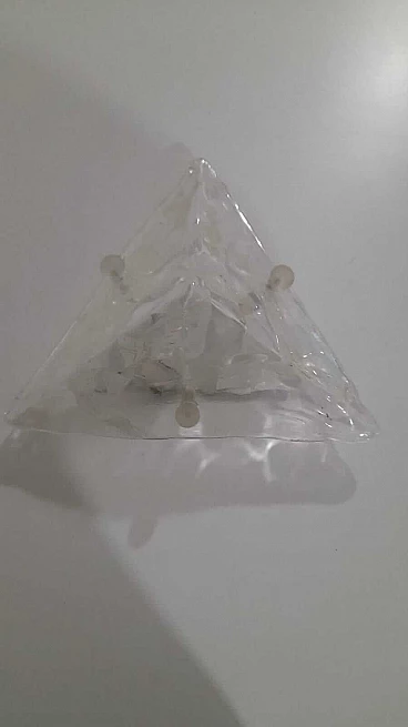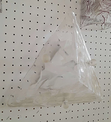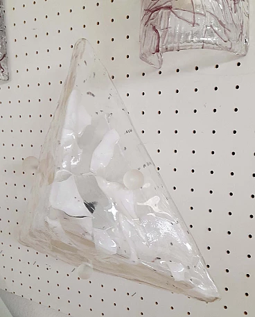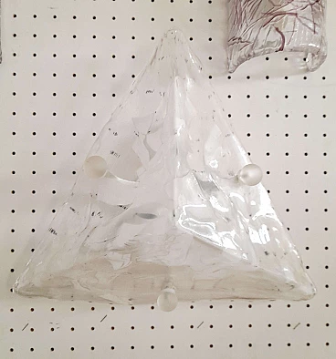 Three pyramid-shaped Murano glass wall sconces, crystal colour with white flakes. The lamps were made by the well-known Venetian company Sylcom, synonymous with quality and a guarantee of Made in Italy. The wall lamps date back to the 1990s, they are no longer in production with these characteristics, last three available, new, the lamps were only on display. Each measures 35 cm per side and has a depth of approximately 12 cm. They mount an E27 bulb, compatible with LED and energy-saving lamps. The classic shape, in perfect Murano style, and the neutral colours make these lamps perfect for tastefully illuminating all rooms in the home.