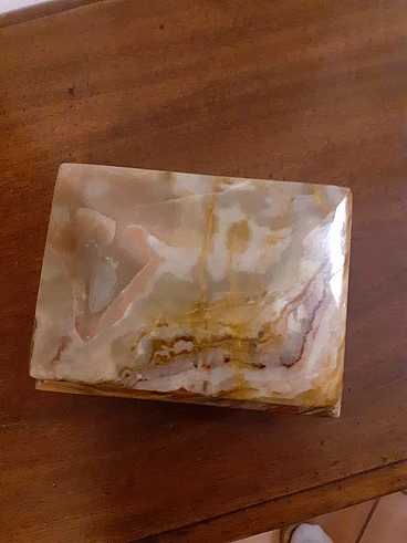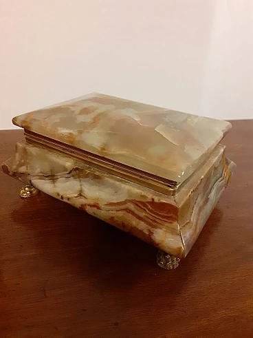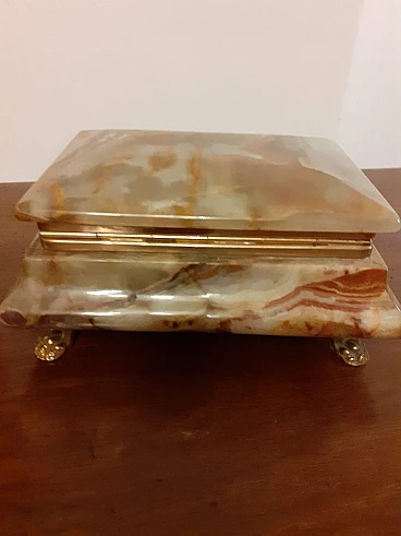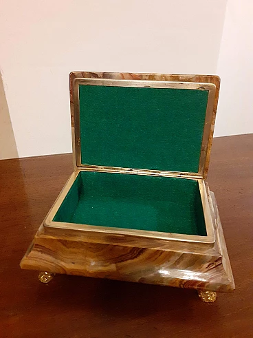 Onyx and brass jewelry box with lion's paw feet, 1960s-70s. Green felt inside. It has a few small scratches and normal signs of time on brass parts.