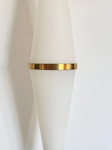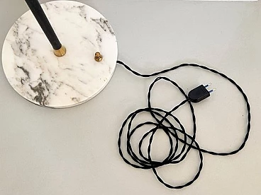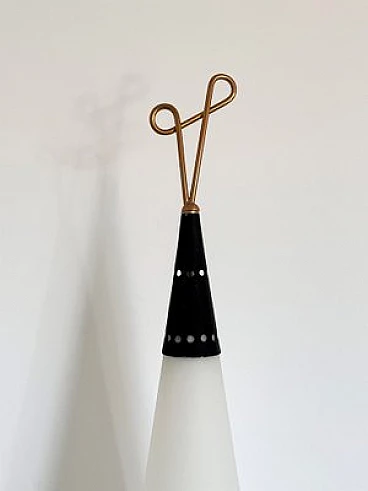 The base of the lamp is made of marble, on which the original brass switch is mounted. The two parts of the milky glass shade are held together by a brass ring. At the top there is a black metal grommet on which a playful brass detail is screwed. The brass parts have been polished, the marble cleaned.