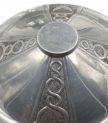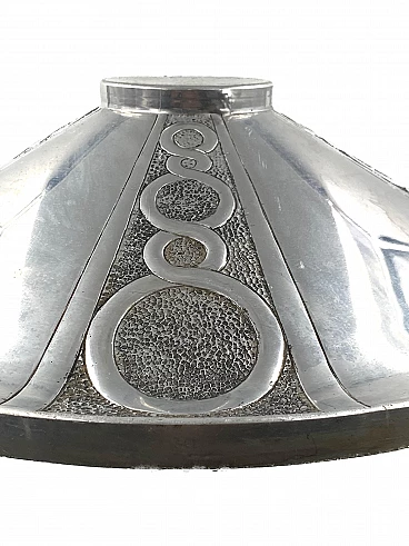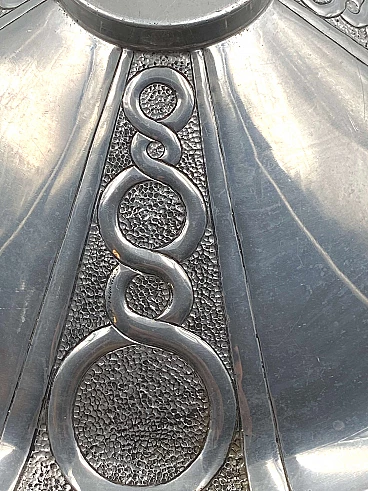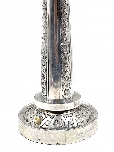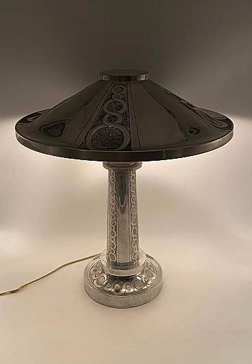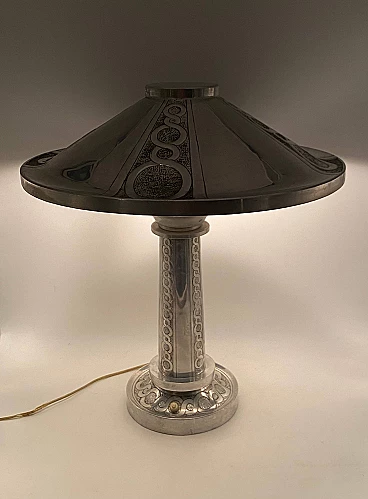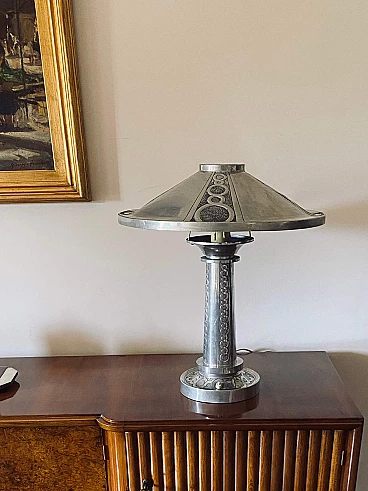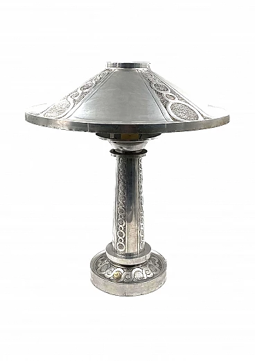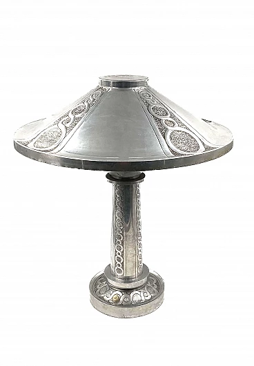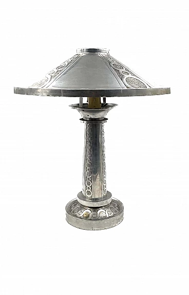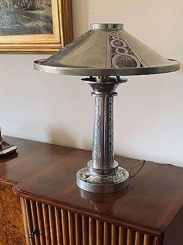 Art Deco embossed metal table lamp, made in France in the 1920s. Richly decorated by hand. Totally original with embossed details on the lampshade. Functioning.