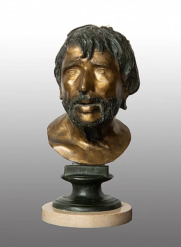 Antique sculpture in burnished bronze depicting the head of the philosopher Seneca. The head of the Greek philosopher Seneca is also known as Pseudo-Seneca as it was discovered in Herculaneum in 1754 and found in the National Archaeological Museum in Naples. The original located in the 1st century B.C. was the inspiration for numerous sculptors and artists who reproduced its features in bronze castings. Provenance: 20th century Naples. Diameter 20 cm, height 48 cm. Certificate of Authenticity. We are at your disposal for further clarification or photographic details. Shipping throughout Italy, Europe and the rest of the world at very low prices with maximum security and traceability. Shipping will be agreed privately.