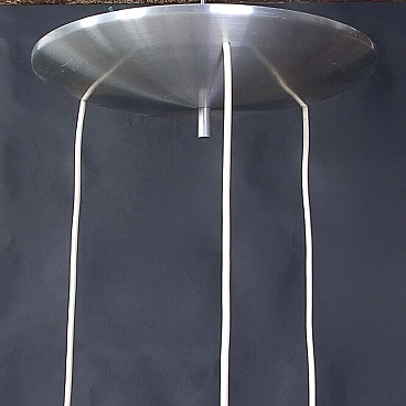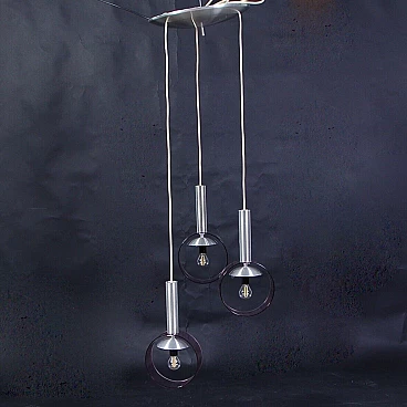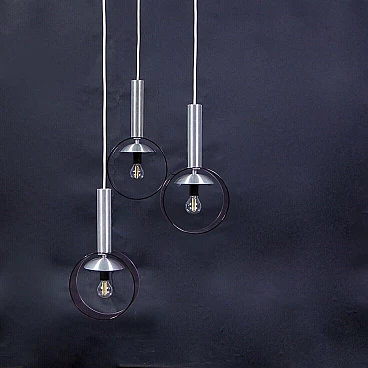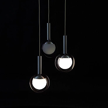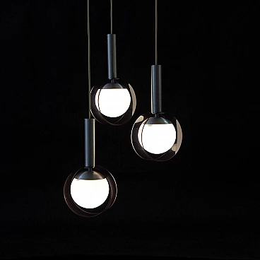 Three cables descend from the disc placed on the ceiling, each with a final lampshade in a postmodern style.