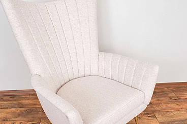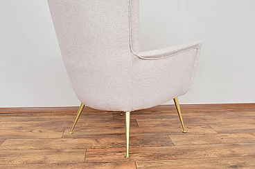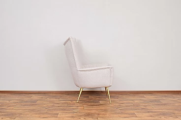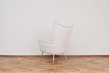 This armchair was made in the 1960s in Italy. The furniture has undergone professional upholstery restoration and has been reupholstered in beige wool. The legs are gilded, preserved in their original, very good condition.