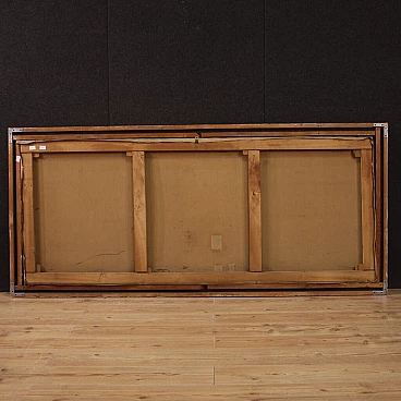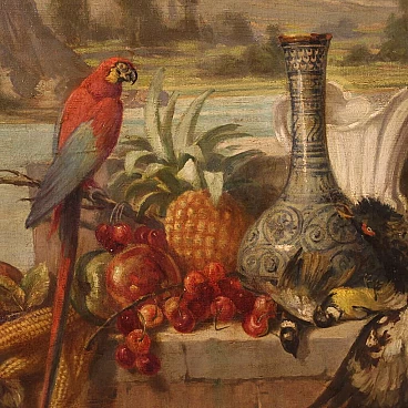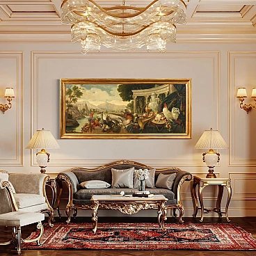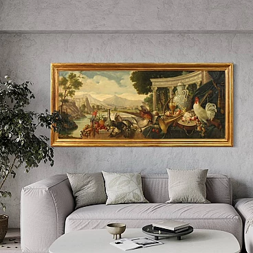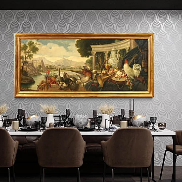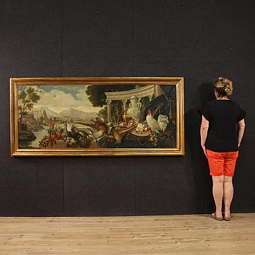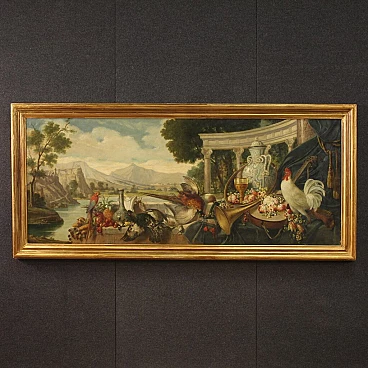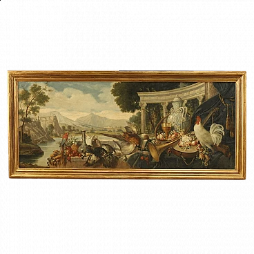 Oil painting on canvas ("in prima tela") made in the first half of the 20th century and depicting a landscape with a rich still life. Painting that unfolds horizontally, of exceptional size and luminosity, adorned with carved and gilded wooden frame (bronze tint). Work signed at lower right "G. Ceragioli" (see photo), referable to painter Giorgio Ceragioli (1861-1947); lacking authentication. Painting part of a pendant (see photo and ask for price of the pair if available). Painting rich in decorative elements: flowers, fruit, game, ceramics, musical instruments; embellished with classical architecture and amphitheater with columns on the right (see photo). Painting in beautiful patina that has undergone some minor conservation restoration with patches visible on the back (see photo). Size without frame: 80 x 201 cm.