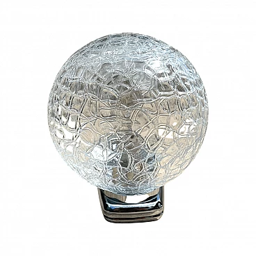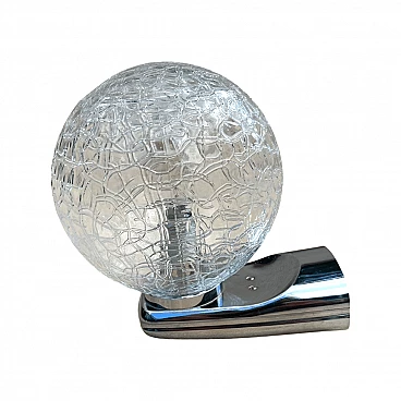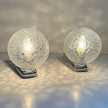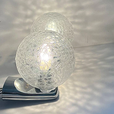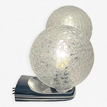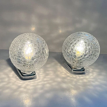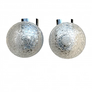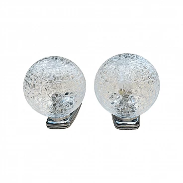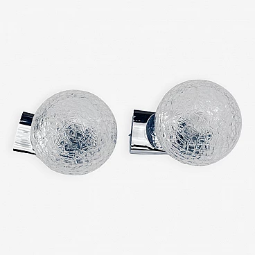Pair of wall lamps model 56520 in mid-century modern style with Hollywood elements, made by Dusselplastic in West Germany in the 1980s. The lamps have pressed glass shades with interesting decorations, mounted on a chrome-plated plastic base. The sconces are inspired by a pearl in a shell. Articles preserved in original, very good condition, spots undamaged. Wall light for a single e14 bulb up to 60w. Dimensions: height 18 cm; width 15 cm; depth 20 cm; shade diameter 15 cm. Dimensions in inches: height 7.1 inches; width 5.9 inches; depth 7.9 inches; shade diameter 5.9 inches.