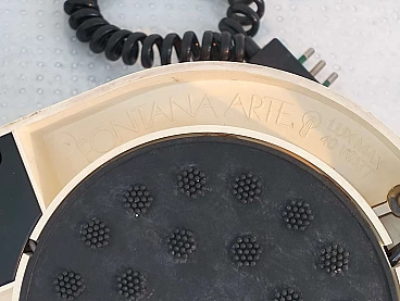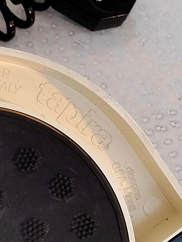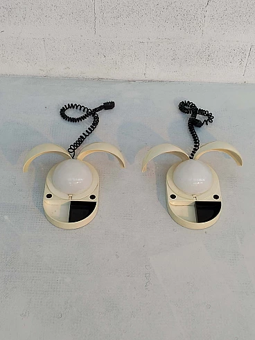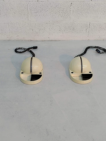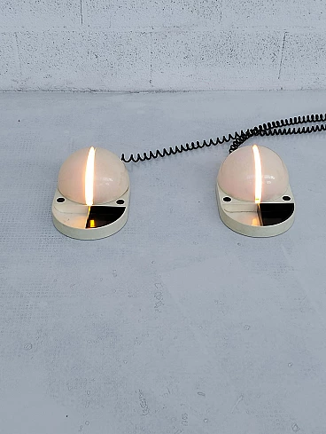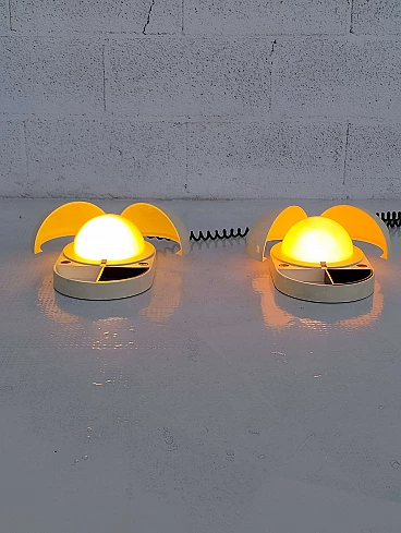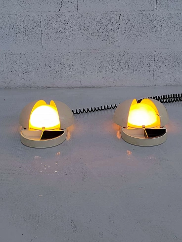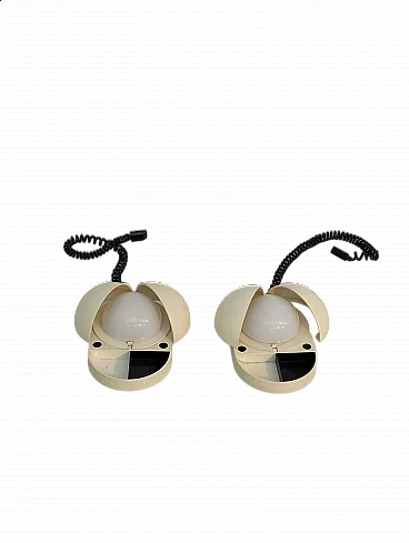 Pair of Tapira table lamps by Gianemilio Piero and Anna Monti for Fontana Arte, 1970s (designed in 1974). Made of white Makrolon with domed glass light diffuser. The "wings" can be adjusted to shield the glass thus controlling the amount of light emitted. The front section has a fixed semi-circular recessed tray. The lower section is embossed with the names of the designer and manufactory. The lamp is published in Repertorio del Design Italiano 1950-2000 by Giuliana Gramigna (p. 408). FontanaArte S.p.A. is an Italian company founded in Milan (as Fontana Arte) in 1932 by Luigi Fontana and Gio Ponti and specializing in glass processing and the creation of furnishing accessories. It is known for working with curved crystal and producing lighting fixtures, becoming a leading name in Italian design over the years.