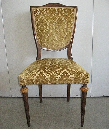 Group of seven Empire style chairs made in Brianza in the 1960s-70s. Wooden structure, seat and backrest covered with yellow patterned fabric. Wooden parts have no damage, padding and varnish are original and show signs of time, upholstery is in good condition. In need of restoration. Seat height: 47 cm.