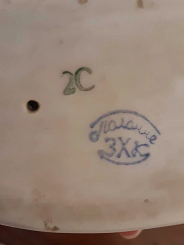 Porcelain sculpture with overglaze decoration depicting the goalkeeper Lev Jašin, late 1920s. Komintern porcelain manufactory, Gorodnica, Ukraina. Light brown mark on Biscuit, almost illegible.