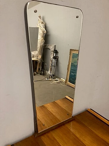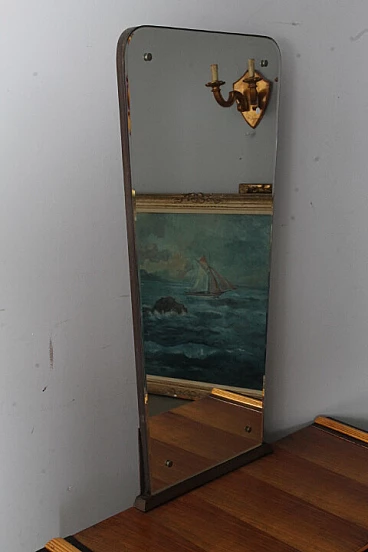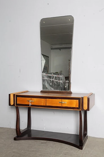Antique vanity table of beautiful design, 1940s-1950s Art Deco period, Milan. Made with removable mirror upper part, lower part with wavy line base, two drawers made of different wood essences: birch, walnut and mahogany with relief profiles. Contemporary fittings and handles. Separate chest of drawers belonging to the same room. Restored ready for use. Base height 60 cm, total height 160 cm, width 101 cm, depth 44 cm.