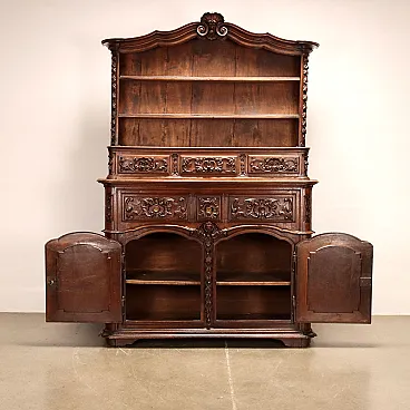 Sideboard with plate rack, consisting of two doors, three under-top drawers and three at the base of the riser. Front and sides richly carved with curlicue and rocaille motifs and uprights carved with phytomorphic festoons, mask on the platter and manly protome between the doors at the base. Italy, last quarter 18th century.