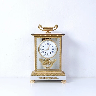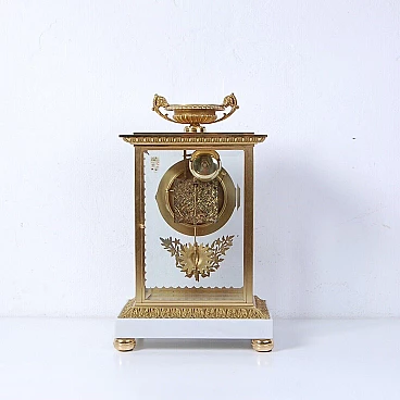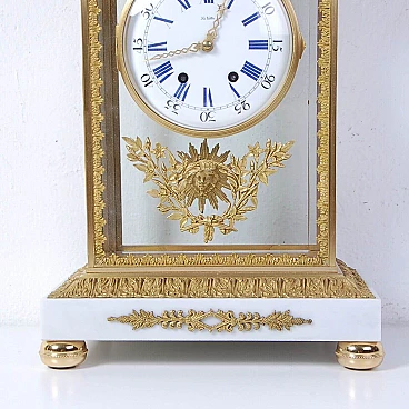 Beautiful table clock in Empire Napoleon III style. White Carrara marble base, display case with frame and rich decoration in chiselled and gilded bronze. Domed dial in white enamel with beautiful gilded hands, the whole protected by a domed glass. Large chiselled pendulum of the mask of Bacchus.