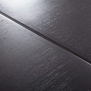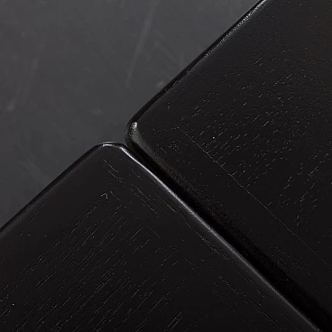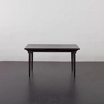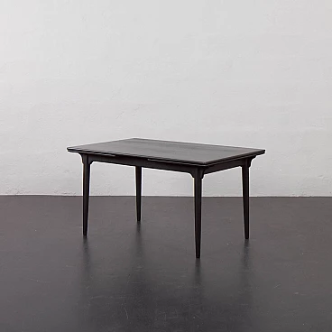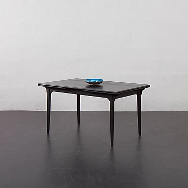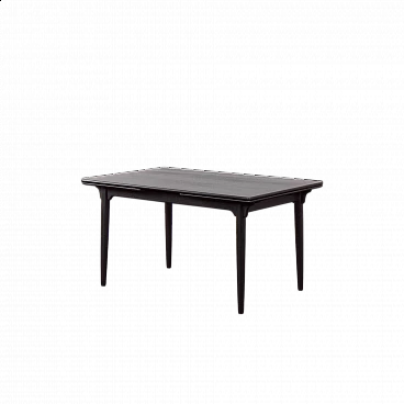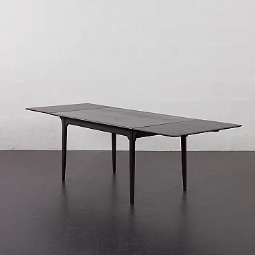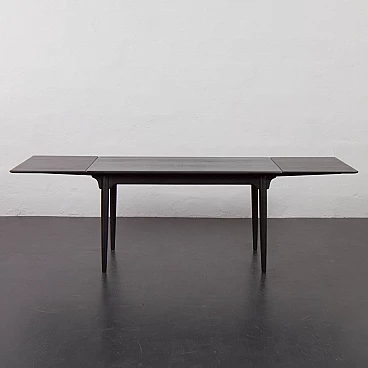 Danish black painted dining table designed and manufactured in 1960. It is made of teak veneer with remarkably finished solid teak wood edges and has solid teak legs, entirely painted in satin black. The table has the possibility of opening the top. The table design provides for the leaves to be stable extensions of the main table top. Two additional leaves, 52 cm wide, extend the table to 239 cm, providing comfortable space for 8 or 10 persons. The table top's beautiful grain and high-quality workmanship enhance the elegance of Danish mid-century design. The legs are detachable for convenient transportation. Our team has thoroughly checked the table and the wooden rails work flawlessly. The table has been cleaned and the lacquer applied from scratch. The overall condition is excellent, with minimal signs of use. Dimensions of fully extended table: H: 73/W: 239/D: 90 cm. Height of chair 60 cm.