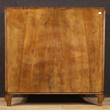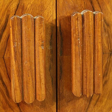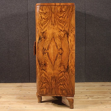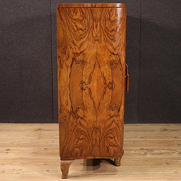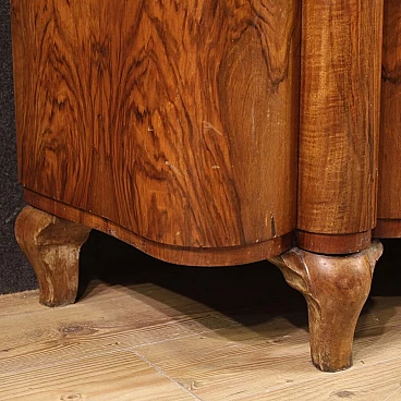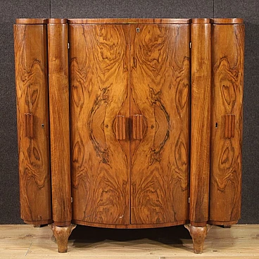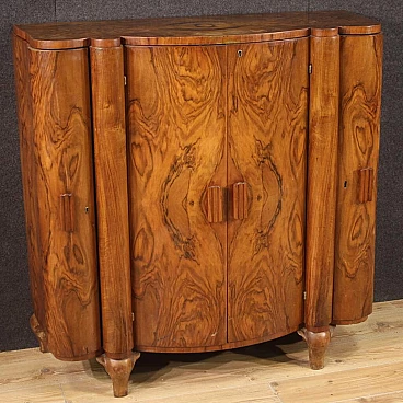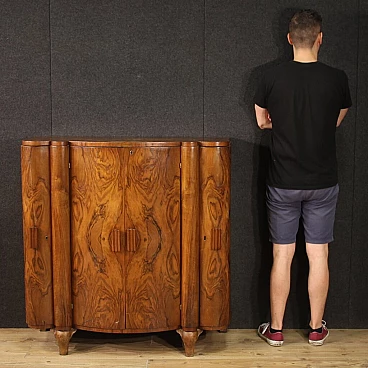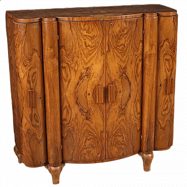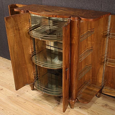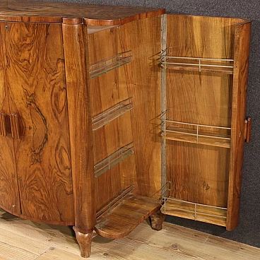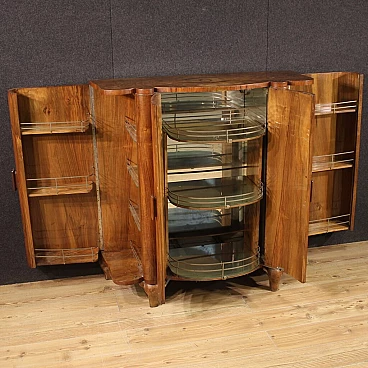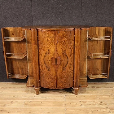 Italian bar cabinet from the mid-20th century. Beautifully carved and veneered cabinet in walnut and briarwood. Moved and curved bar cabinet with two side doors complete with several small glass shelves. Central doors with a mirrored bottom and three mirrored shelves with metal ring ideal for displaying bottles and digestifs. Central doors with a special mechanism that causes the internal shelves to slide forwards and backwards in relation to the opening and closing of the doors. Ideal bar cabinet for a lounge or study, for antique dealers and interior decorators. Shows some signs of wear, structurally sound. Interior lighting not working, in need of restoration. Lacking keys, cabinet in overall good state of preservation.