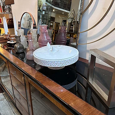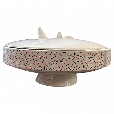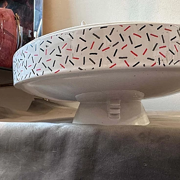 Elegant centrepiece designed and produced in Italy by Mas in the 1980s, in perfect condition. It consists of two parts, a base and a lid, and is marked on the bottom. The Milan Memphis style of the 1980s was a design movement known for its bold, eclectic and avant-garde approach to furniture and decorative arts. Emerging in Milan, Italy, it quickly gained international recognition for its bright colours, geometric shapes and playful aesthetics. A remarkable piece from this era is this ceramic centrepiece by Mas. This centrepiece exemplifies the characteristics of the Memphis Milano style with its unconventional design and vibrant colour palette. The piece is made of ceramic, a very popular material at the time, known for its versatility and ability to display intricate details. The choice of white, red and black colours adds striking contrast and underlines the boldness of the design. The purpose of this centrepiece would generally be to serve as a decorative object for a table or display surface. Its bold design and vibrant colours undoubtedly attract attention and become a topic of conversation in any setting. It represents a departure from traditional design norms, embracing a more experimental and artistic approach.