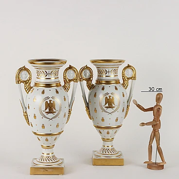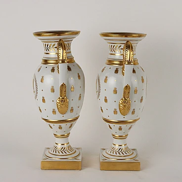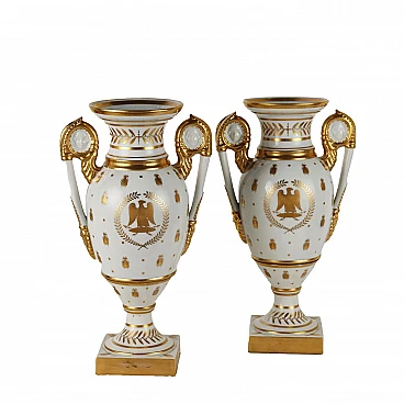 Pair of porcelain vases with gold decoration in Empire style. They feature fly decorations, with the imperial eagle on one side and the 'N' of Napoleon on the other. The vases bear on the bottom the gilded crown mark of the Parisian manufactory that made them.