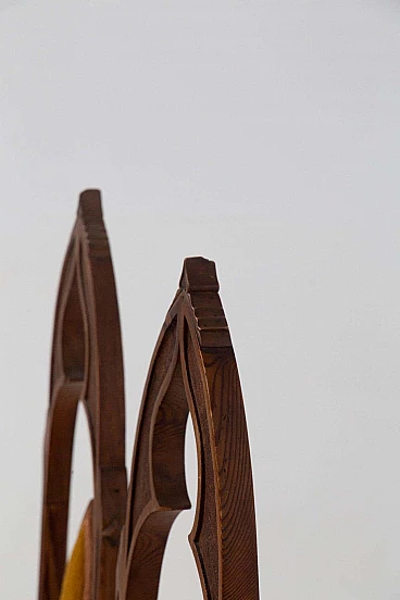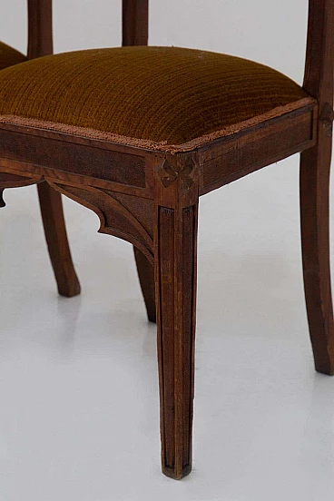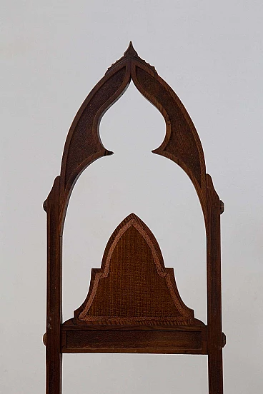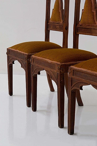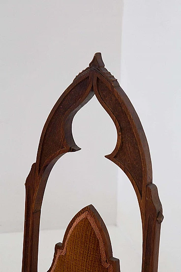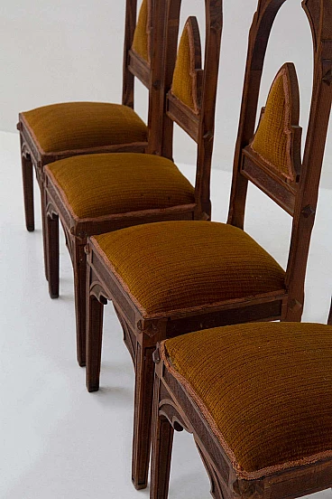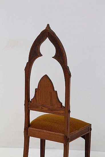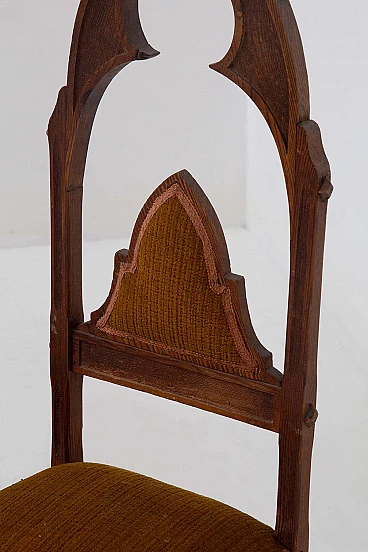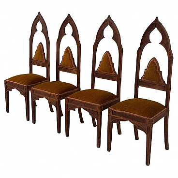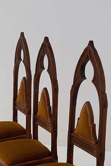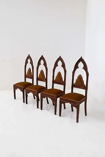 Enter the enchanting world of Venetian Gothic elegance with this exquisite set of four chairs, handcrafted circa 1920, each a wooden masterpiece. Running your fingers over the smooth surface, you will be captivated by the delicate inlays and intricate woodwork that adorn these chairs, a testament to the skilled craftsmen who created them. But it is the backrest that steals the show: a bold homage to the unmistakable Gothic style. Rising majestically in a pointed arch, the backrest boasts unique pointed vaults and domed recesses, a sight to behold. Gently stroking the small backrest, one feels the softness of the luxurious velvet upholstery, a touch of opulence that invites one to sit down. And what a seat it is! Adorned in rich orange corduroy, it will make you feel at ease as you savour the grace of the Gothic era. Every inch of these chairs has been carefully designed and crafted, right down to the elegant carved elements that grace the legs, adding a touch of sophistication to the whole. Imagine these chairs gracing your living or dining room, effortlessly elevating the ambience with their timeless beauty. They are more than just chairs: they are a portal to the past, a glimpse of the grandeur that adorned Gothic Italy. With these beautiful chairs, one not only embraces history, but also an artistic legacy that transcends time.