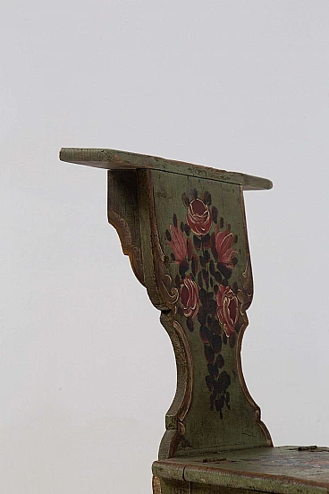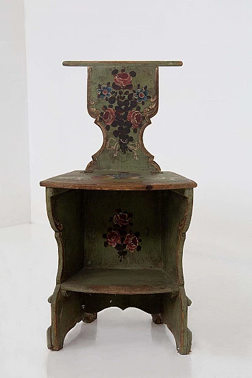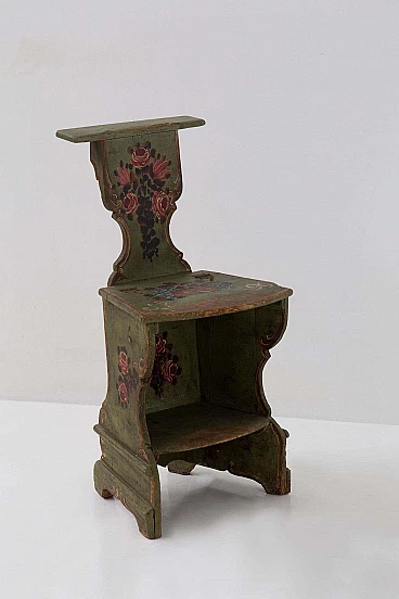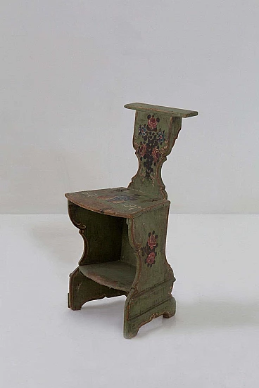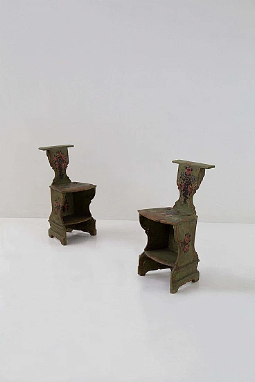 A pair of antique chairs, made of walnut wood with a polychrome technique, bearing witness to a bygone era. Admire their majesty, for they date back to the late 1700s and their age is engraved on the seat in ancient script: 1797, a year whispered in the breeze of history. A special feature of the chairs is the folding seat. When the seat is gently unfolded, it turns into a kneeler that invites reverence and contemplation. But it is their polychrome painting that steals your breath, a symphony of colours adorning the wood with delicate painted flowers and ornamental motifs. The skilful hand of a long-lost artist is immortalised in the vibrant brush strokes and hues that dance like poetry on the wooden canvas. Baroque in form, they embody the essence of their time, exuding opulence and grace. They are silent witnesses to a world of grandeur, a world of dancing elegance and refined taste. Their curves and lines echo the harmonious melodies of a bygone era, where art and craftsmanship danced in unison. When we look at these antique chairs, we cannot help but be enchanted by the stories they carry. Stories of encounters in candle-lit rooms, of whispered conversations and heartfelt confessions, of laughter and merriment that once filled the air. These chairs have spanned the centuries, bearing witness to the ebb and flow of generations. Their seats are engraved with the date: 1797. Imagine them today, proudly placed in classical living rooms, where nostalgia intertwines with contemporary splendour. Or imagine them in elegant winter gardens, where the gentle caress of the sun lingers, embracing the timeless beauty of days gone by. In their presence, they remind us of the impermanence of all things, but also how art can transcend the limits of mortality. Let us preserve these antique chairs, for they are more than just furniture: they are living remnants of the embrace of history.
