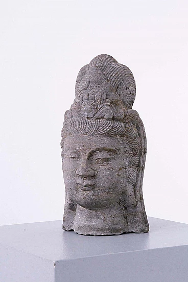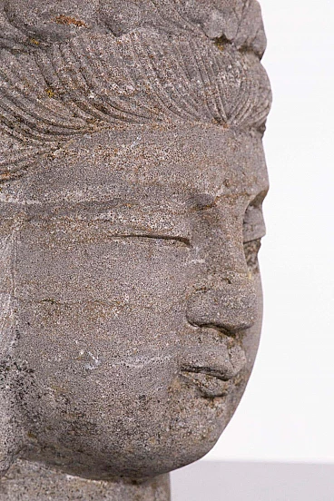 The lava stone Buddha head sculpture, which came from India in the early 1900s, is a remarkable work of art that encapsulates the rich cultural and artistic heritage of the region. Carved in stone, this sculpture represents a significant aspect of Buddhist iconography and symbolism. The Buddha's head has great significance in Buddhism as it represents the enlightened mind and serves as a focal point for meditation and contemplation. The serene expression, closed eyes and gentle smile on the sculpture's face evoke a sense of inner peace and tranquillity. The intricate details and craftsmanship demonstrate the skill and dedication of the artisans who created this masterpiece. Dating from the early 1900s, this Buddha-head stone sculpture offers a glimpse into the artistic traditions of the time. It reflects the influences of the region, incorporating elements of Indian aesthetics and styles prevalent at the time. The stone material used in its construction adds a sense of solidity and timelessness to the sculpture, further emphasising the enduring nature of Buddhist teachings. This sculpture is also a testimony to the enduring legacy of Buddhism in India, a country with a rich Buddhist history and numerous sacred sites. It reminds us of the deep spiritual traditions that have shaped the cultural fabric of the region for centuries. As an artefact from the early 1900s, this Buddha-head stone sculpture carries with it a sense of history and connection to the past. It provides a tangible link to the individuals who created and preserved it, as well as to the cultural and artistic movements of the time. Today, this stone Buddha head is a testament to the enduring beauty and profound symbolism of Buddhist art. It serves as a reminder of the quest for enlightenment and inner peace that continues to inspire people around the world.