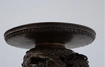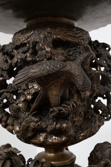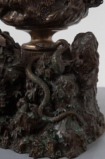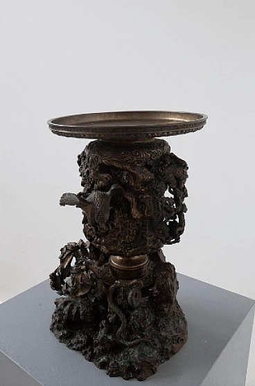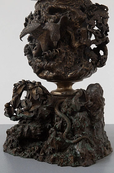 Incense burner in finely chiseled patinated bronze with high relief decoration, made in Japan during the Meiji period (about 1830). The body, with a rotating decoration of snakes and branches, is supported by a base decorated with leaves and snakes. In the central body there is a large phoenix inside paulownia, a typical decorative element of the Meiji period. On the back is an exceptional chiseled work depicting dragons. To complete the piece, there is an openwork plate/lid in the upper part which acts both as a brazier but also as a vase or container. The phoenix and paulownia is a popular combination in Japanese art: the phoenix is said to nest only in the branches of the paulownia, and the appearance of this creature heralds the beginning of a new era of peace and abundance. In original condition: excellent patina and minor scratches.