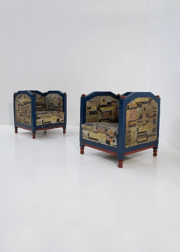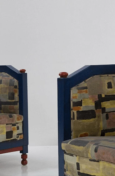Pair of armchairs attributed to Luigi Colombo Fillia, 1920s-30s. Made of meticulously painted blue and red wood, they exude an air of intrigue and charm. The fabric upholstery with motifs typical of Futurism attracts our attention: here we find fluid brushstrokes intertwined with geometric motifs, a visual symphony that encompasses the spirit of the Futurist era. These vibrant and dynamic motifs reflect the movement's fascination with speed, progress and the mechanization of society. A sense of geometric precision and rigor permeates the lines of these armchairs, a design choice that appears almost like a playful illusion, a deceptive geometric game that challenges our perception. It is within this juxtaposition of fluid brushstrokes and rigorous geometry that the soul of the Futurist movement comes to life, inviting us to contemplate the fusion of art, technology and human ambition. An essential element that distinguishes these armchairs is the presence of red lacquered wooden feet in the shape of spherical knobs; these are featured in all the Futurist living room furniture available in other listings. These meticulously crafted elegant details elevate the aesthetic appeal of the furniture, creating an exquisite decoration that catches our eye. These rare Futurist armchairs are a masterpiece of emotional and analytical significance; their painted wood, (original) fabric upholstery and red lacquered feet-knobs intertwine to create a visual symphony that resonates with the soul of the Futurist movement. Seat height: 38 cm.