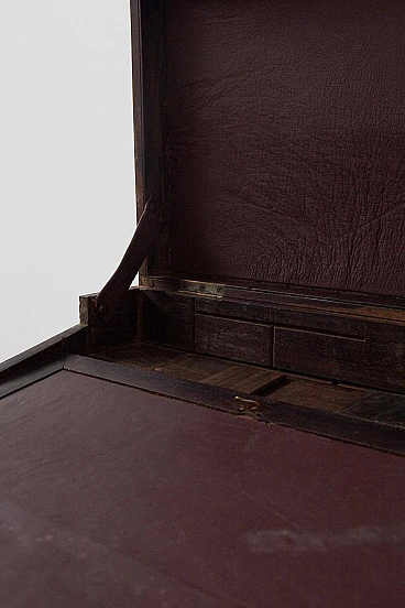 But this extraordinary creation holds even more surprises within its depths. Concealed like well-guarded secrets are numerous hidden drawers and inserts, waiting to be discovered by the curious and the appreciative. Each detail adds to the allure, turning this desk into a treasure trove of wonders.We find the manufacturing mark near the lock.Two brass handles on its sides beckon, inviting you to partake in the grandeur and elegance of this historical gem. As you move it with grace, you can feel the weight of its legacy in your hands, a tangible connection to the past.
