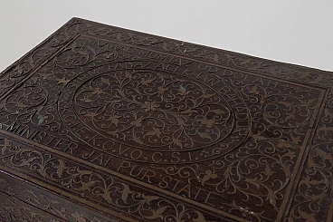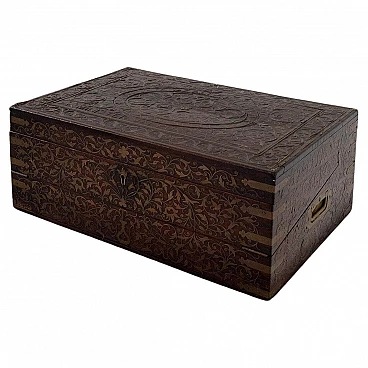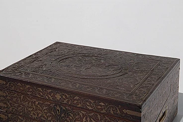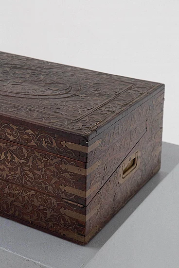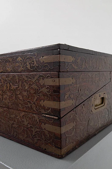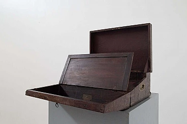 As you run your hands across its surface, you will feel the intricate craftsmanship that dates back to the early 1900s. The carved wood, meticulously chiseled with delicate brass numerals interspersed, tells a story of skillful hands and unwavering dedication. But it is above the box that we discover a hidden treasure: the name of its illustrious owner, engraved forever in history.Gently opening the desk, you'll be transported to a world of wonder and sophistication. Within its casket-like embrace lie various compartments, each surface a testament to the desk's utilitarian brilliance. Small drawers await, eager to hold secrets and mementos cherished by its past guardians. And there, tucked away, lies a letter that once belonged to Marascìa, a whisper of time's passage and the desk's storied journey.