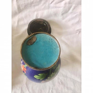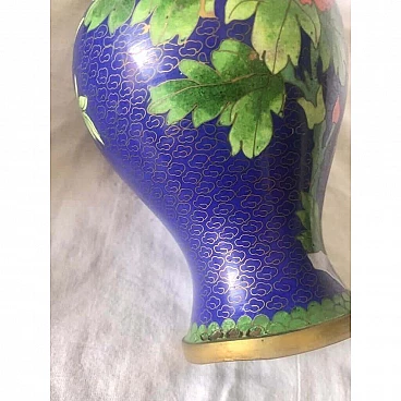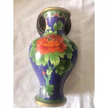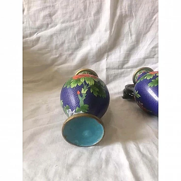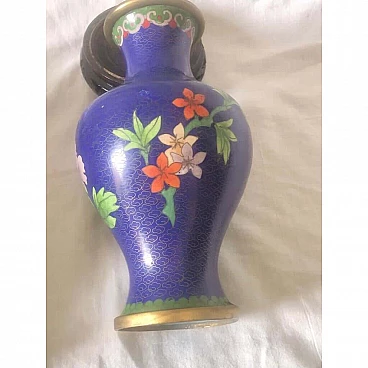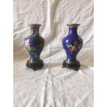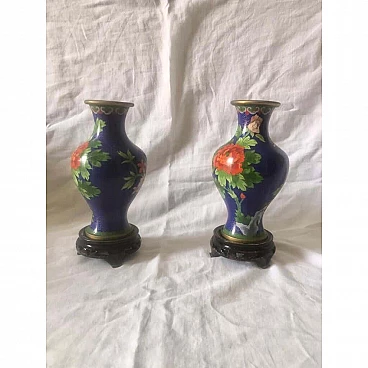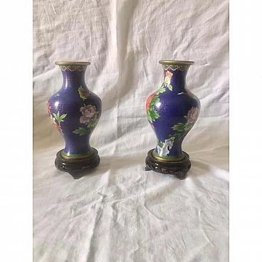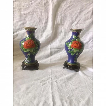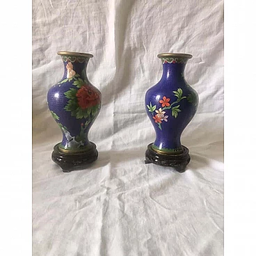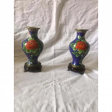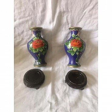 Pair of cloisonné vases with flowers and wooden bases, 1950s